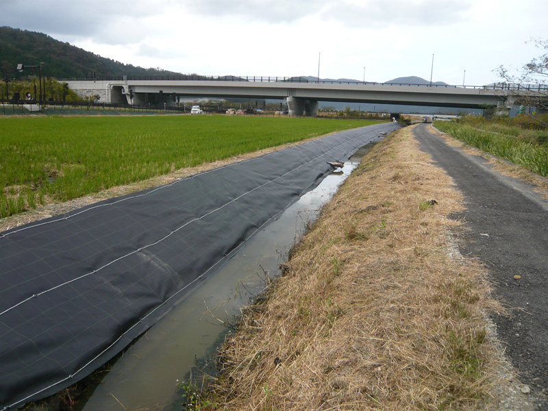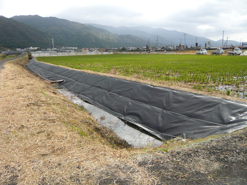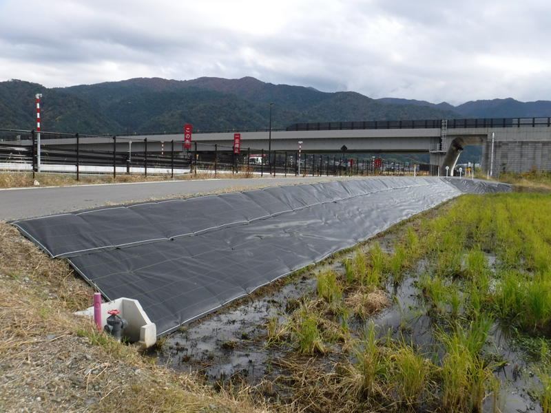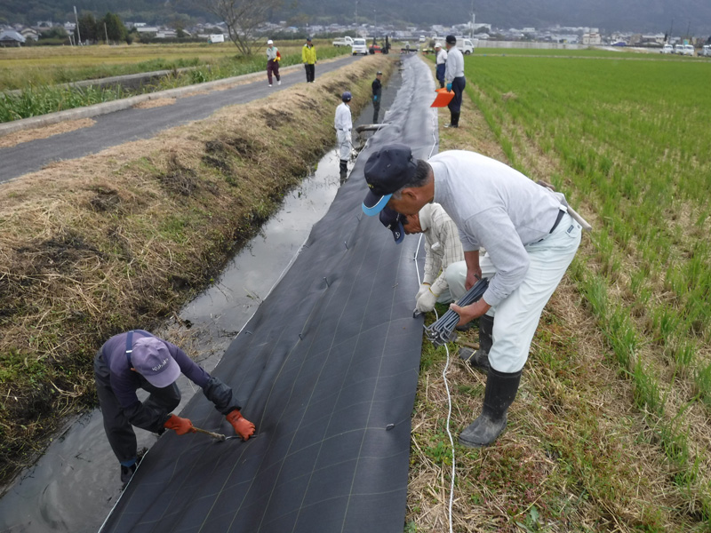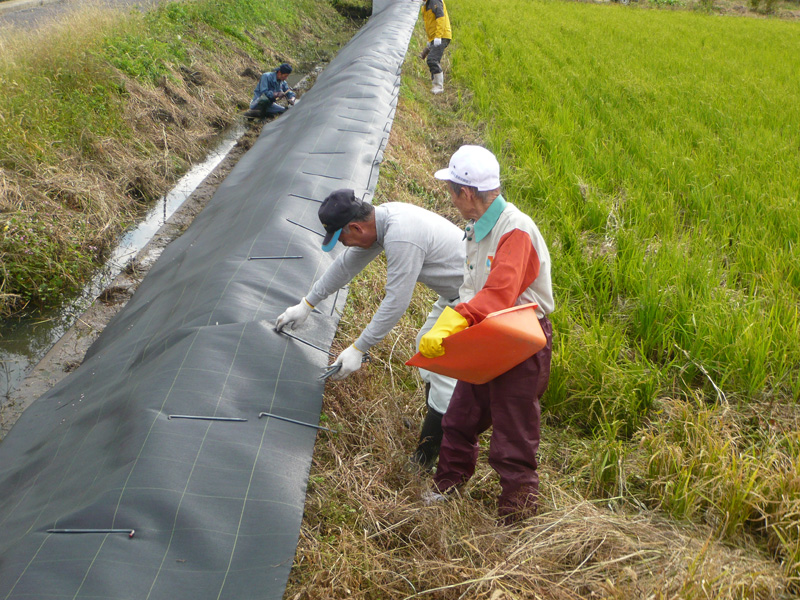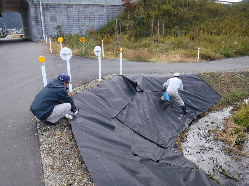 事前に草刈りなど済ませた土手に、防草シート配置して行きます。