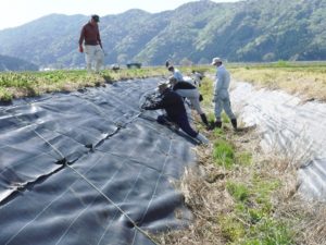 約30名の参加を頂いて、前回の設置を踏まえ、便利な防草シート用接着剤や場所によってはロープで固定する等、丁寧な作業のもと、お昼まで約4時間を経て作業を完了致しました。