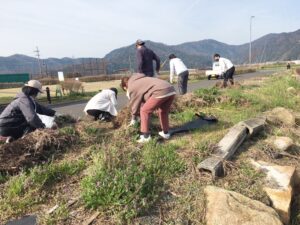 2024年3月24日 / 最終更新日時 : 2024年3月24日 midorikai1 景観形成 育成田防草シート貼り 2024年3月24日(日) まだ肌寒い3月下旬の日曜日、育成田の防草シート貼りを実施致しました。 現在の防草シートが劣化をしており、先ずは杭や廃材の撤去や草刈り作業を行い周辺の地盤を整備。 次に育成田を囲むように防草シートを貼り、ピン留め、田に係る部分には土を盛り押さえる作業を順次行い、約4時間で無事完了致しました。 早朝より人数が少ない中、たいへんお疲れ様でした。