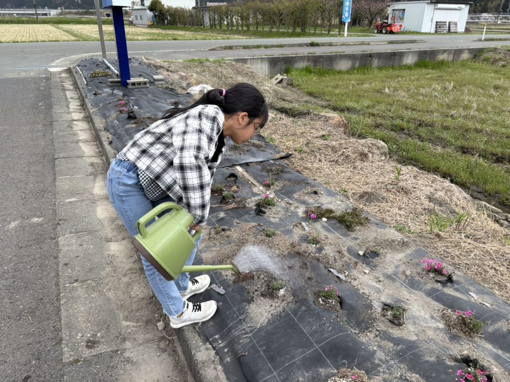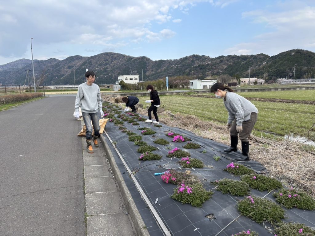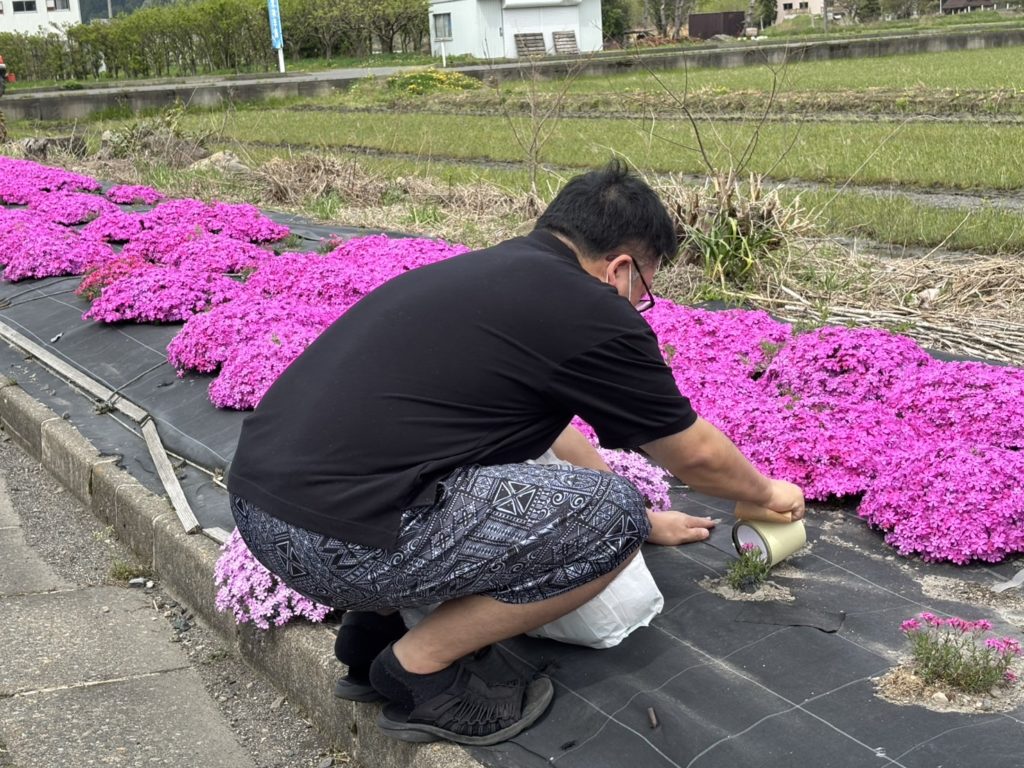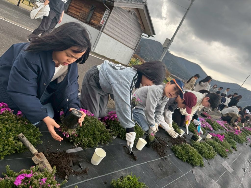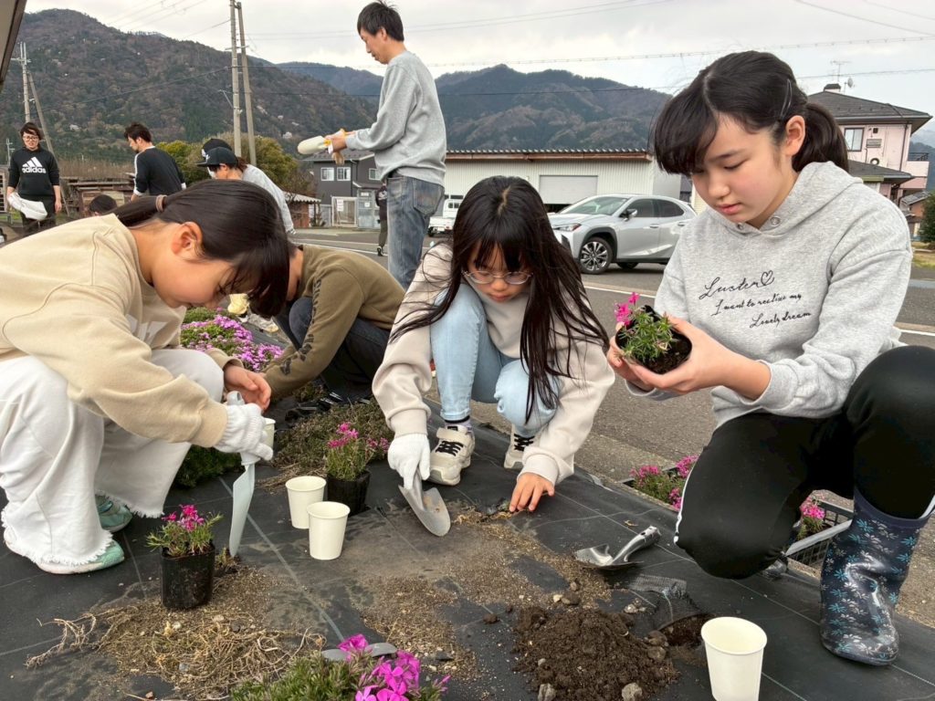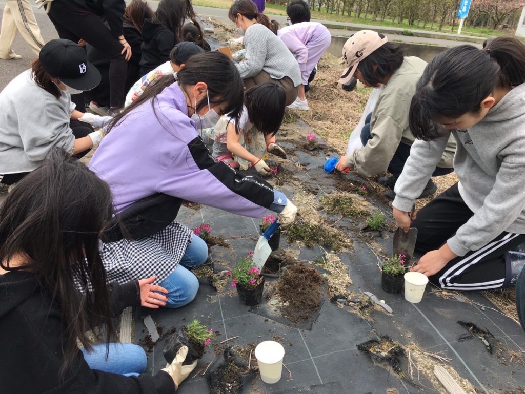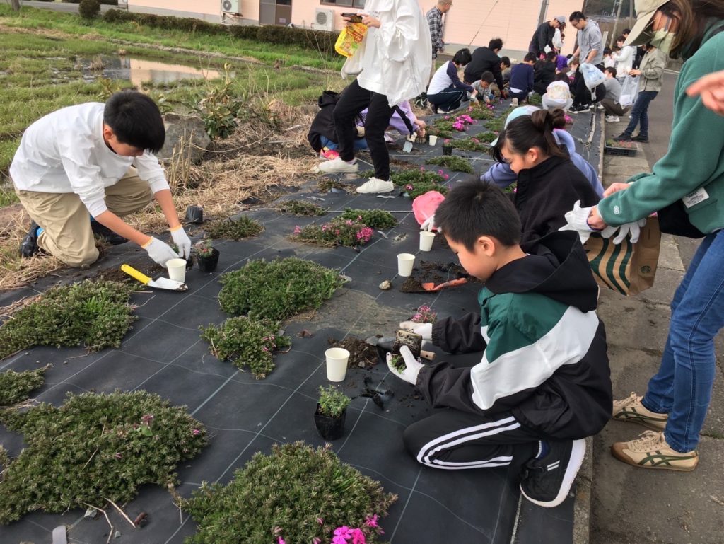 子どもたちの笑顔と明るい声の中、綺麗な芝桜の苗が一つずつ植えられて行き、花壇整備が出来ました。