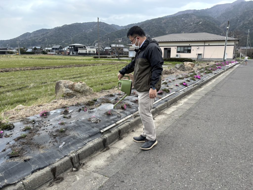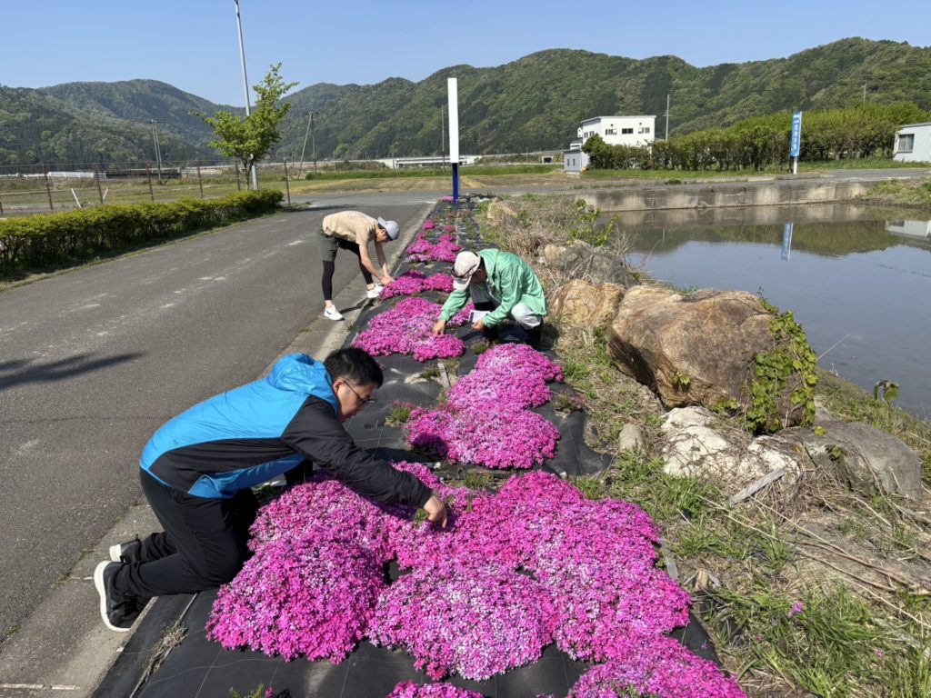 その後は、草取り、水やり、防草シート補修を行い、4月末には綺麗な芝桜が咲きました。